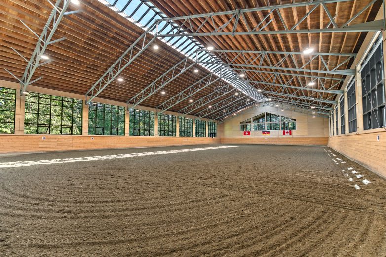 This beautiful 71 by 136 foot private training facility was designed for year-round training and comfort. Featuring an 8-foot wide ridge light, and windows on all sides, this insulated facility combines an abundance of natural light and climate control for a focused riding experience. Custom stalls and an enclosed mezzanine that doubles.