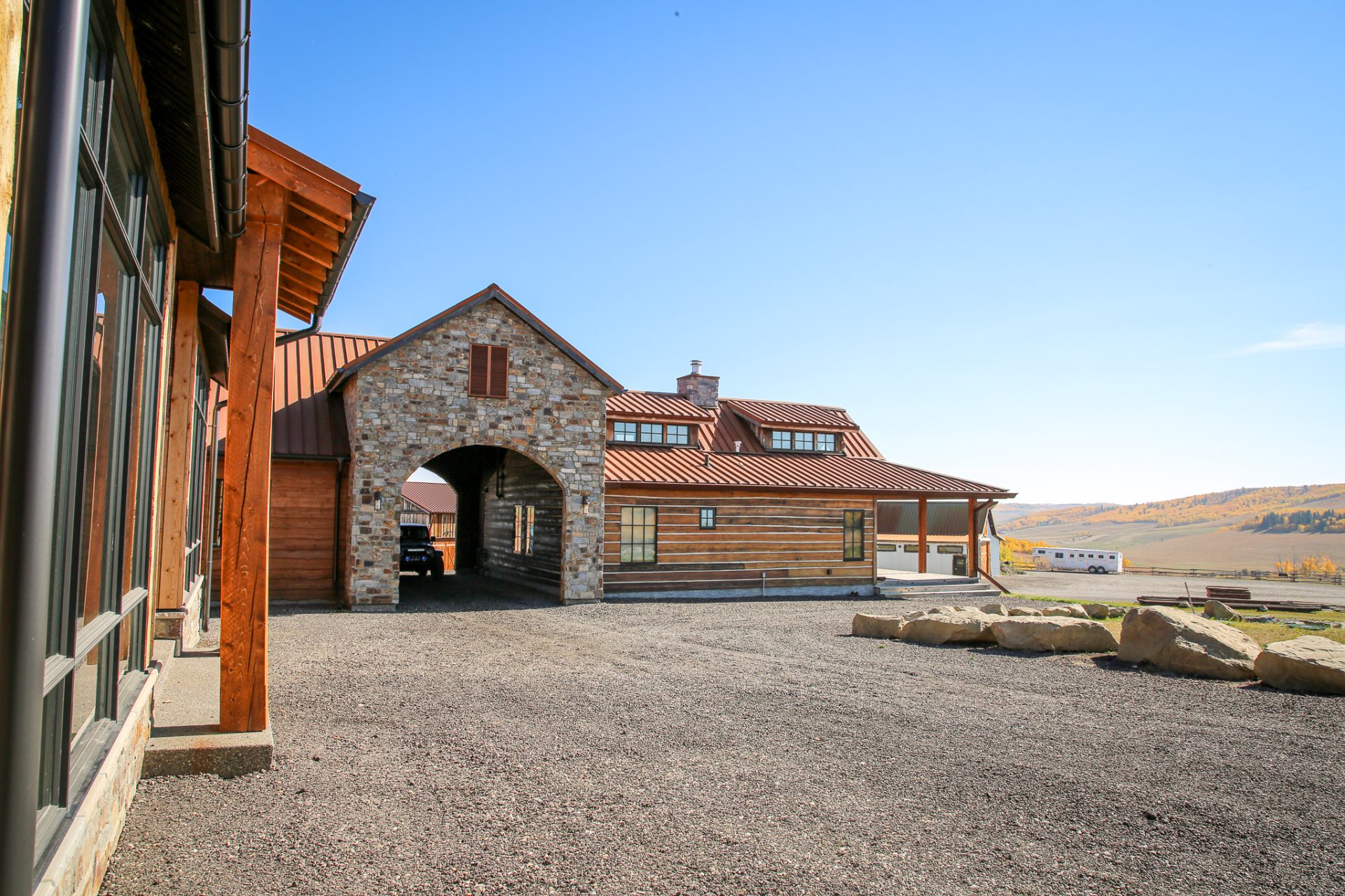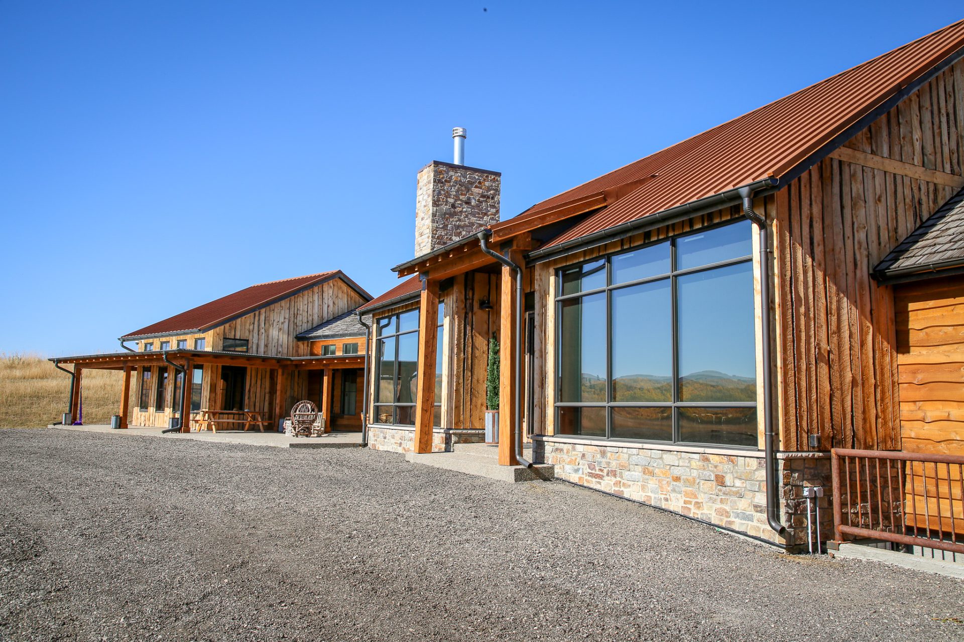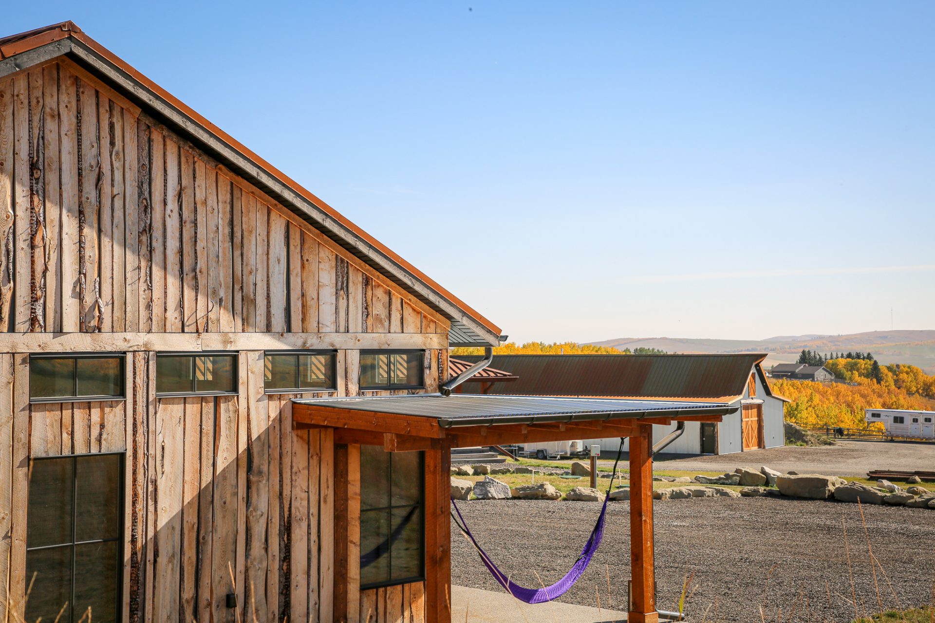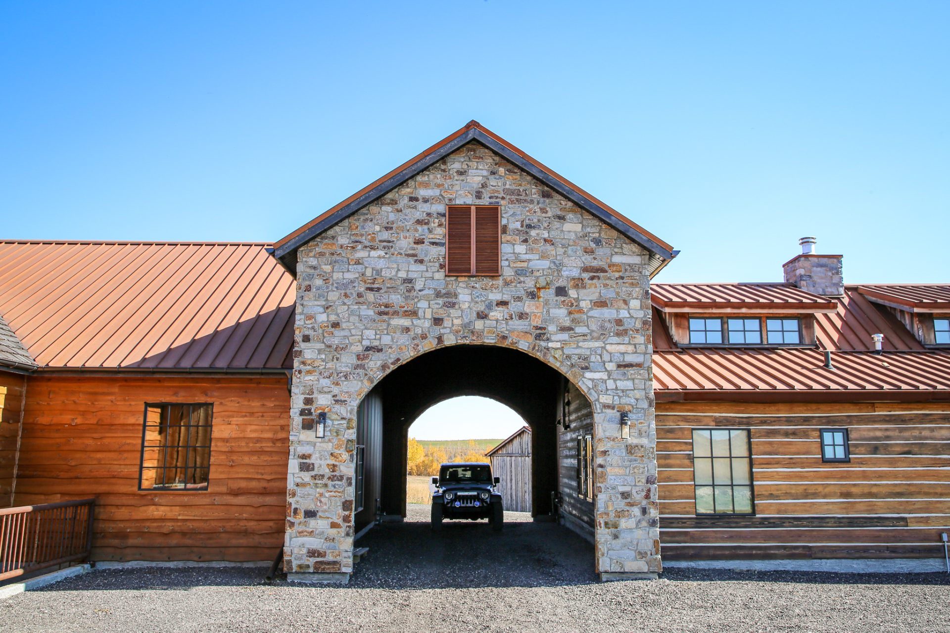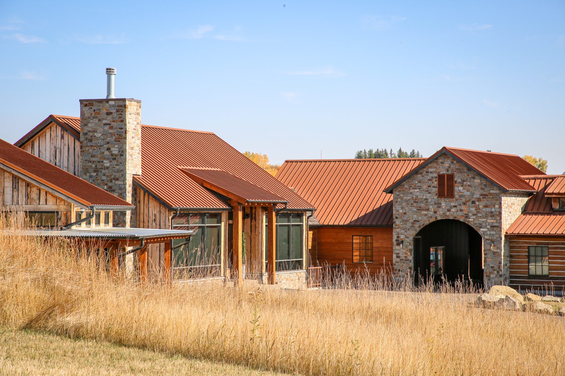This sprawling Albertan rancher features burnt larch siding, a rusted Corten steel roof and reclaimed timber flooring. We used rough-sawn live edge siding and distressed doors for a rustic, authentic look.