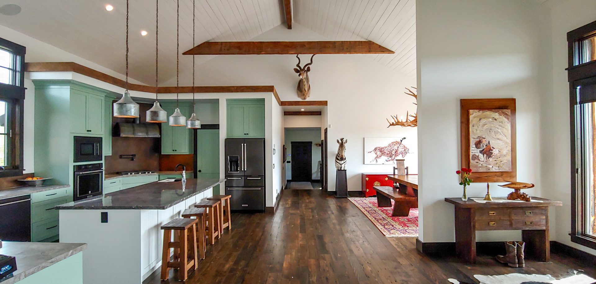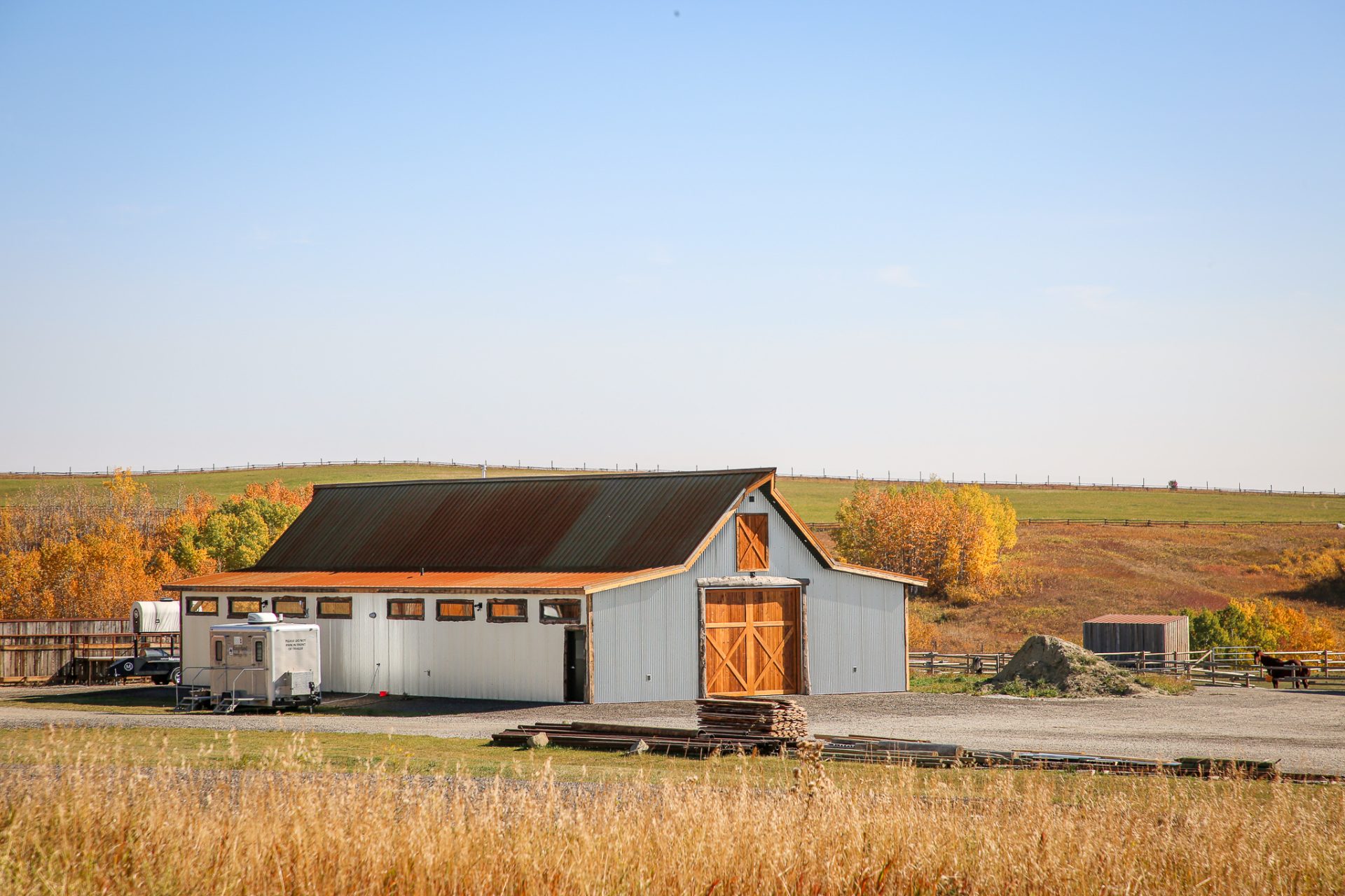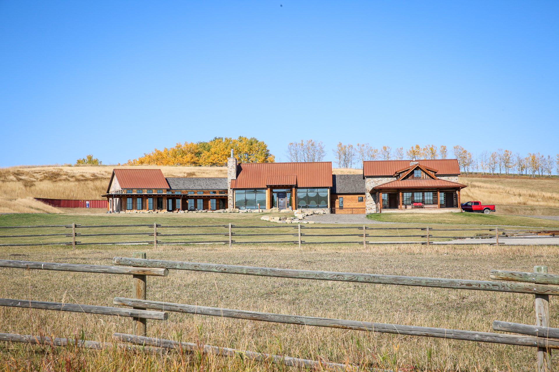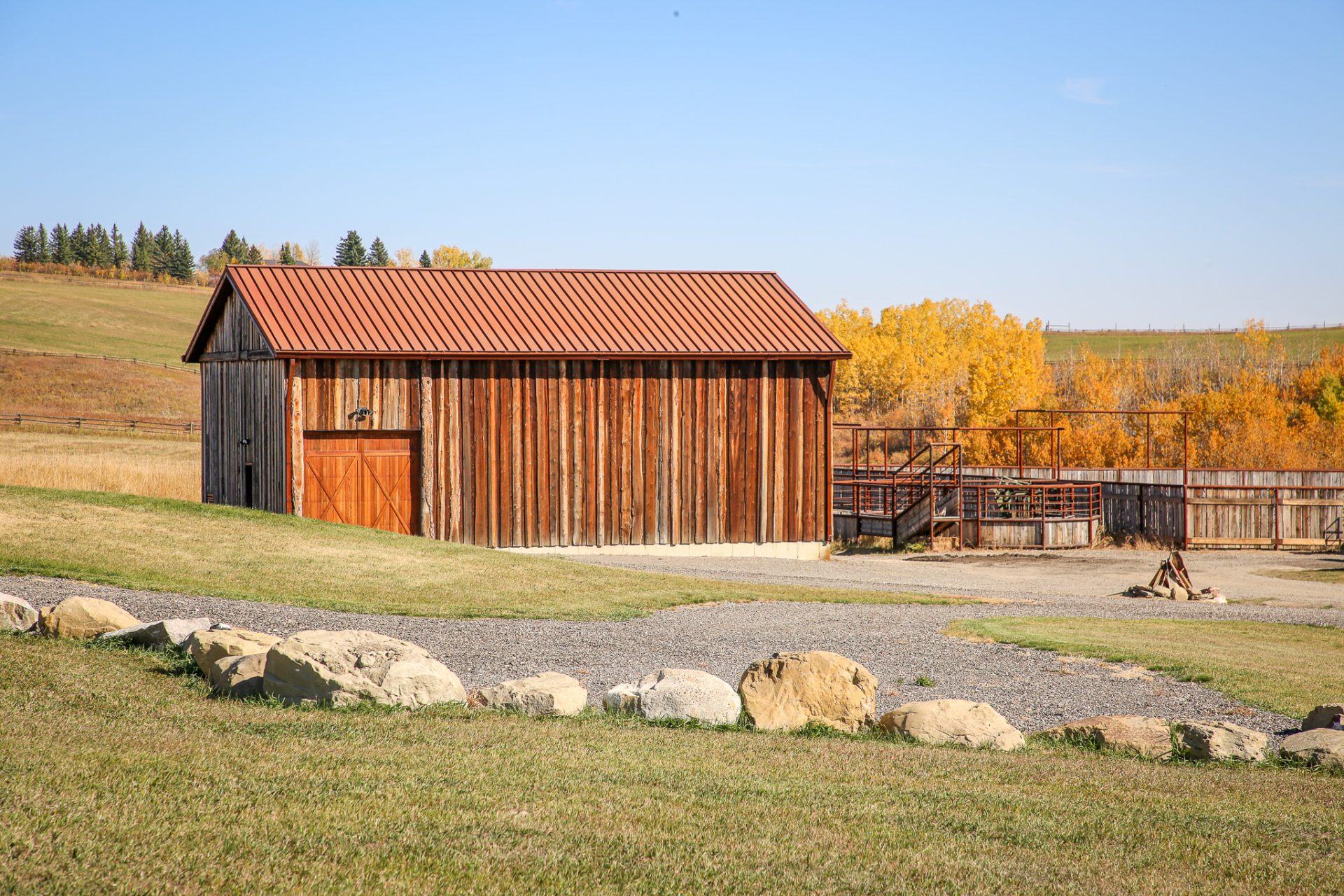 This sprawling Albertan rancher features burnt larch siding, a rusted Corten steel roof and reclaimed timber flooring. We used rough-sawn live edge siding and distressed doors for a rustic, authentic look.