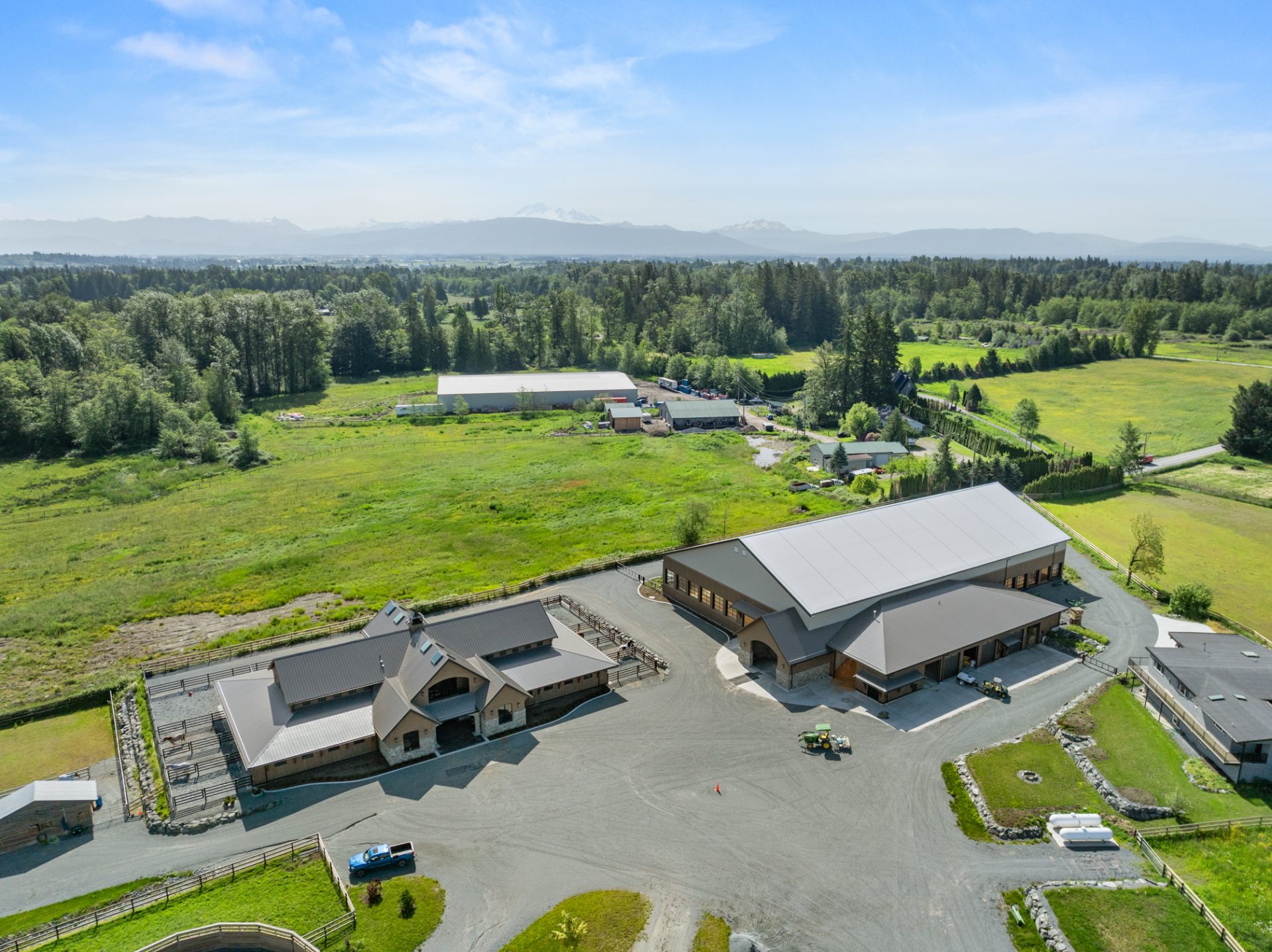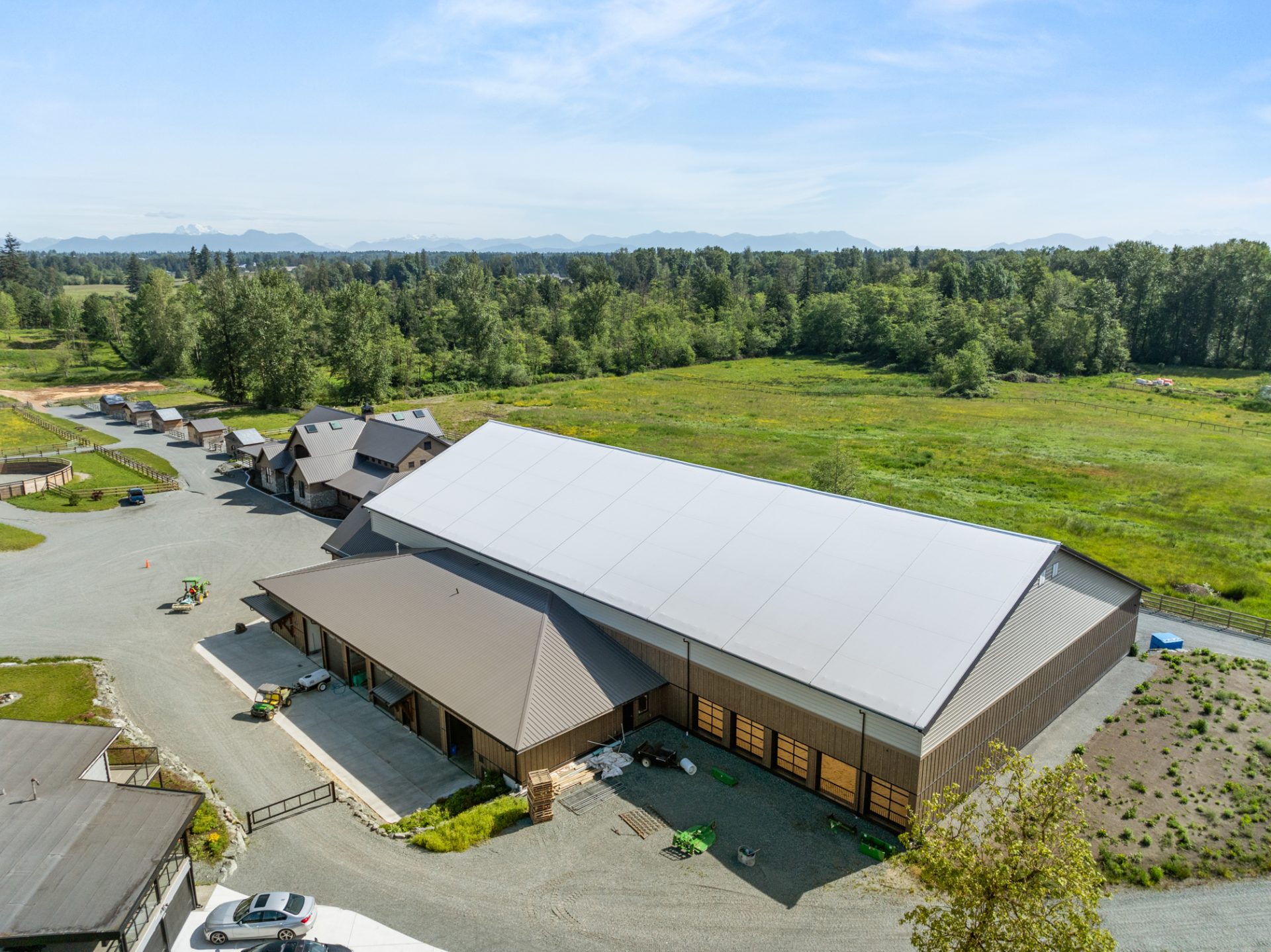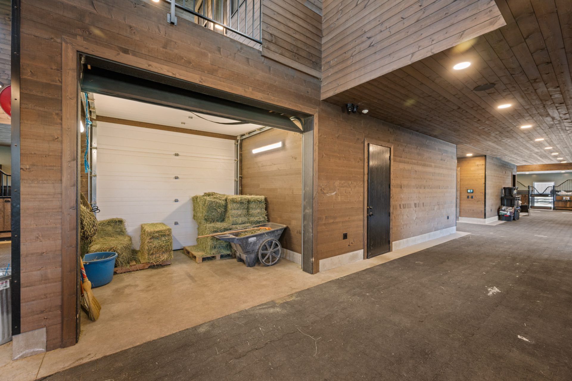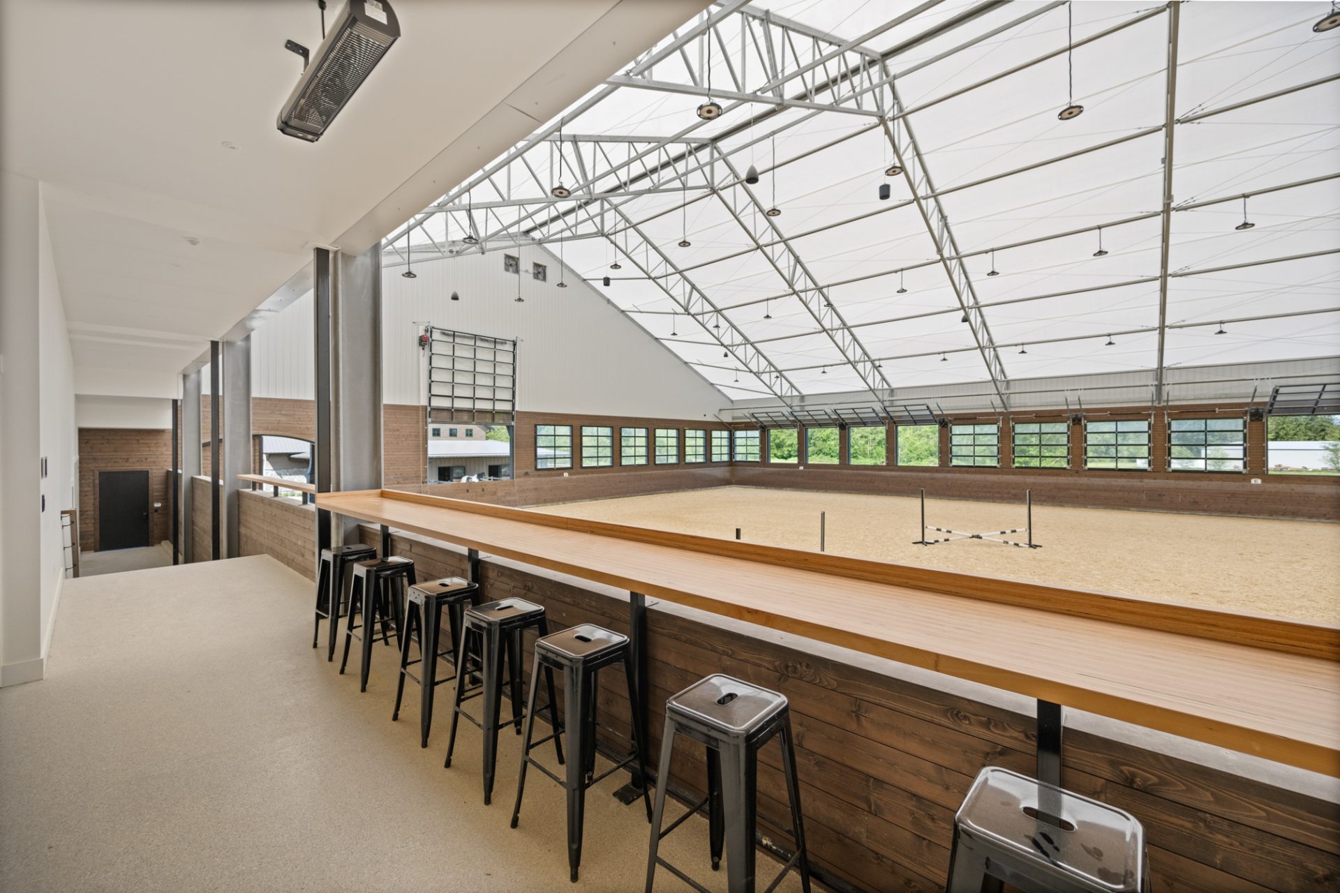 The 100’X180′ indoor riding arena features a staging area, heated viewing area, a brightly lit riding surface and in-wall jump storage. Attached to the arena structure is a 7-port garage with bedding storage, long-term hay storage and utility housing.