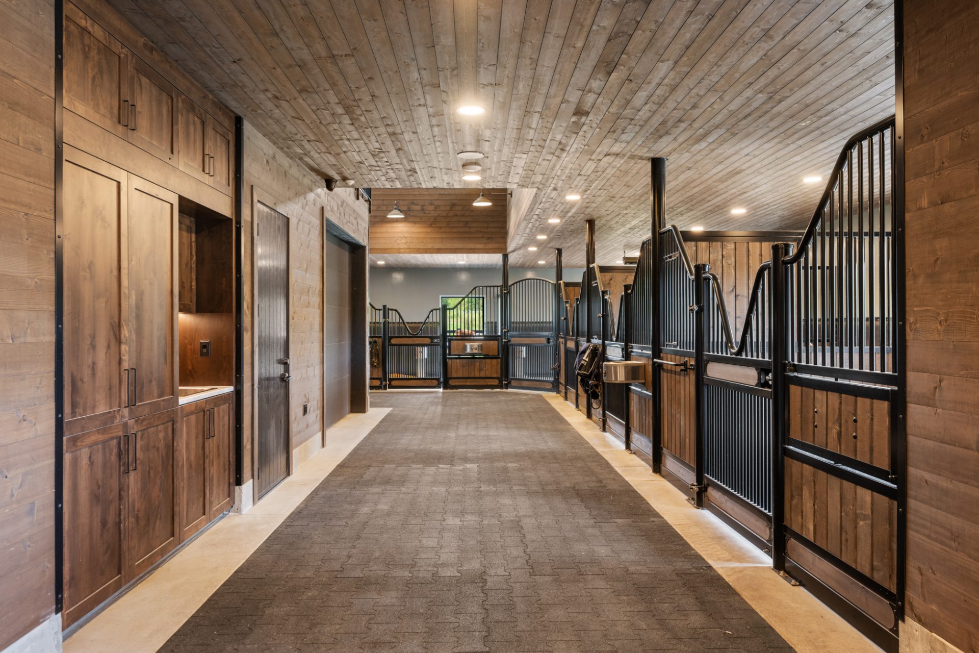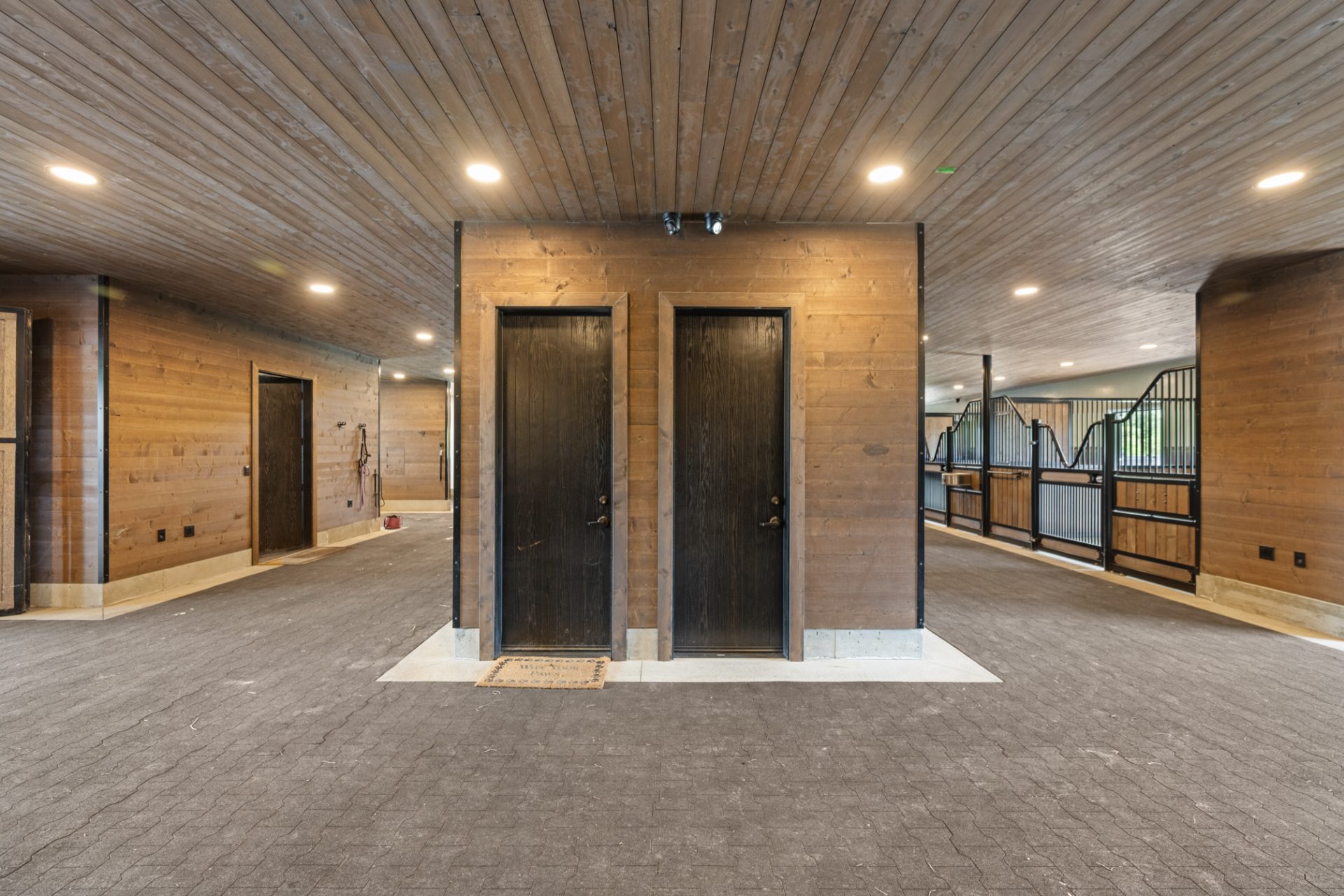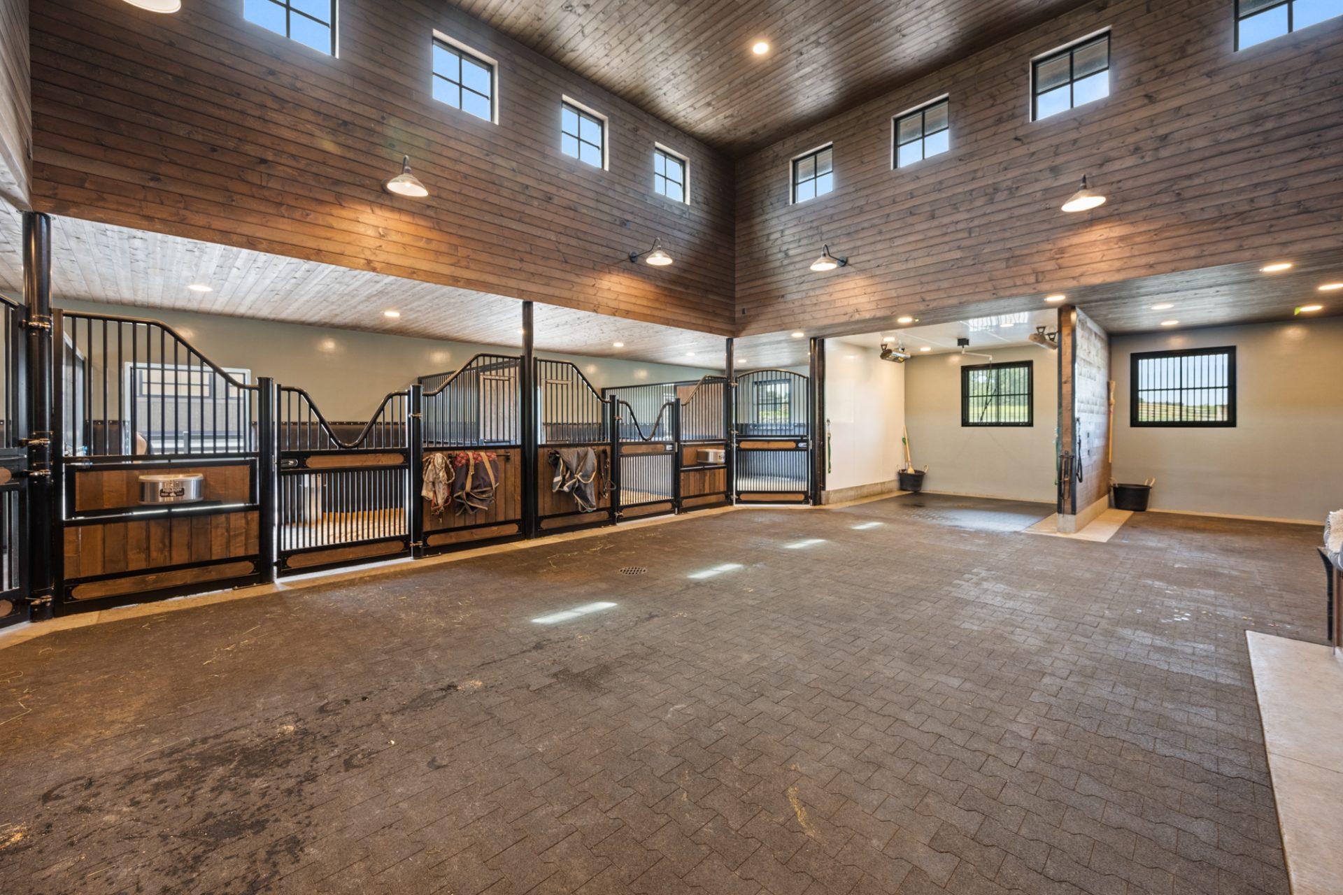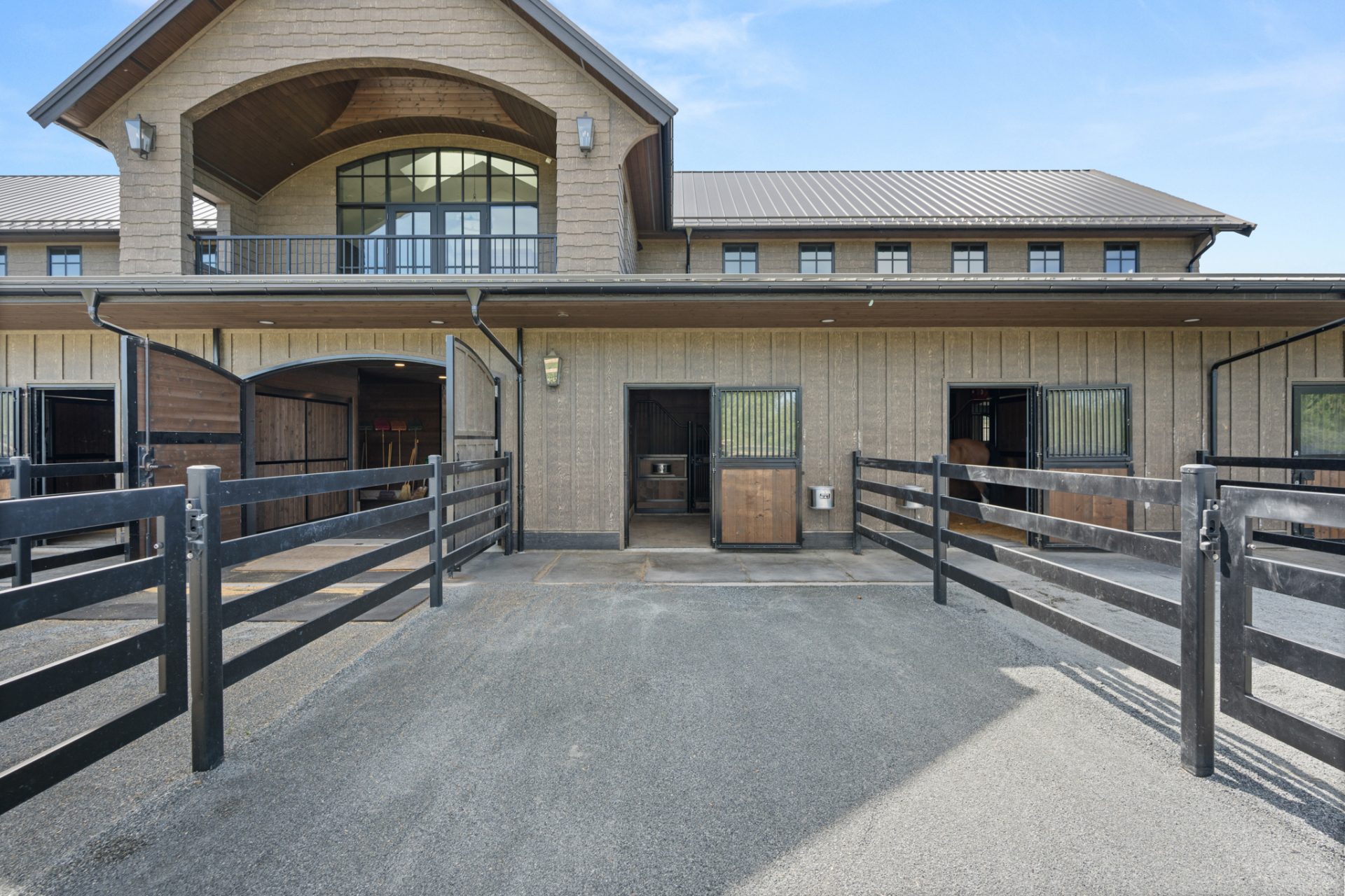This recently completed 14-stall facility includes 2 wash and 2 grooming bays, a feed room, hay room and tools room, a vet laboratory and ventilated blanket closets. Also in the design are two tack rooms; one for private use by owners and one for boarder’s use, equipped with tack lockers.