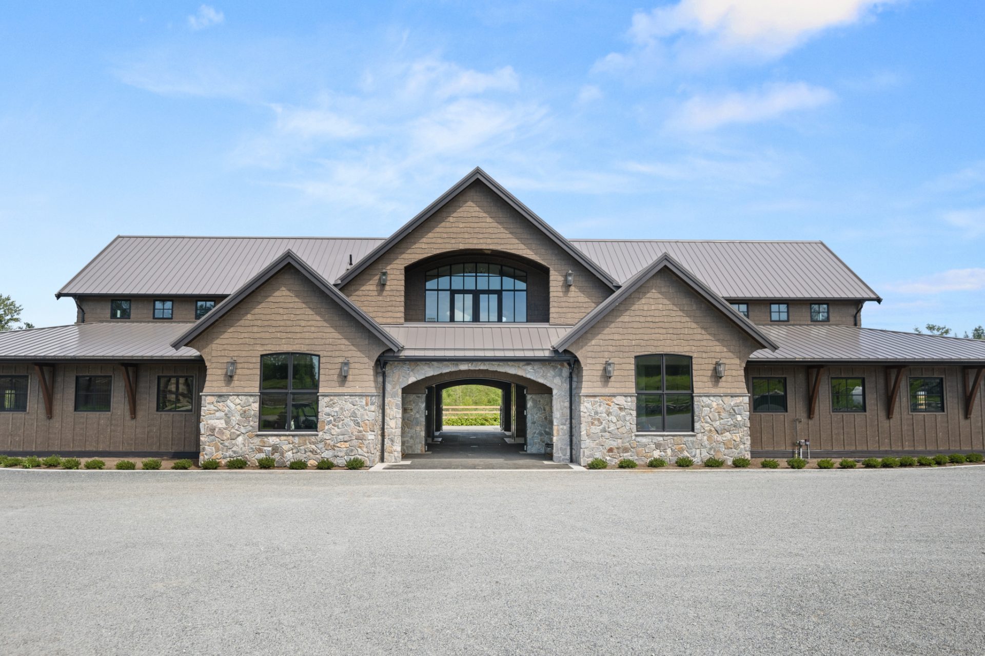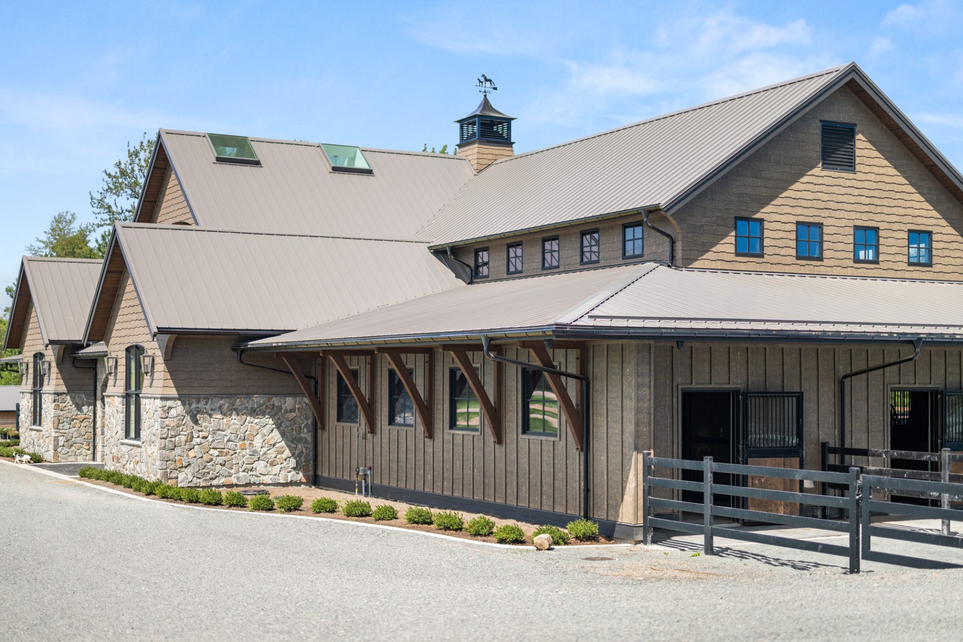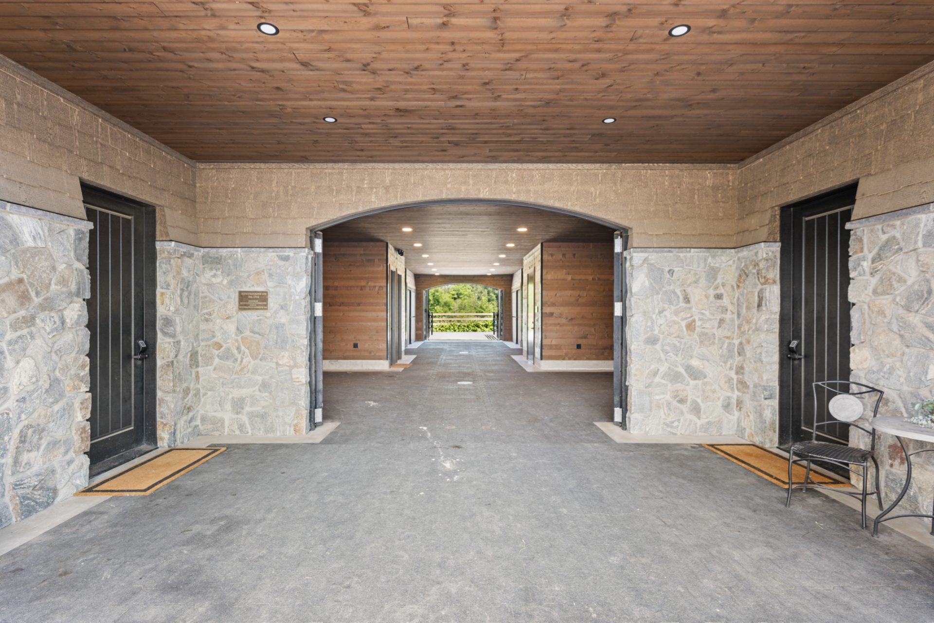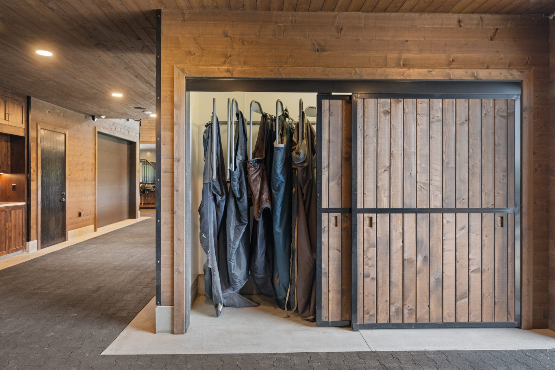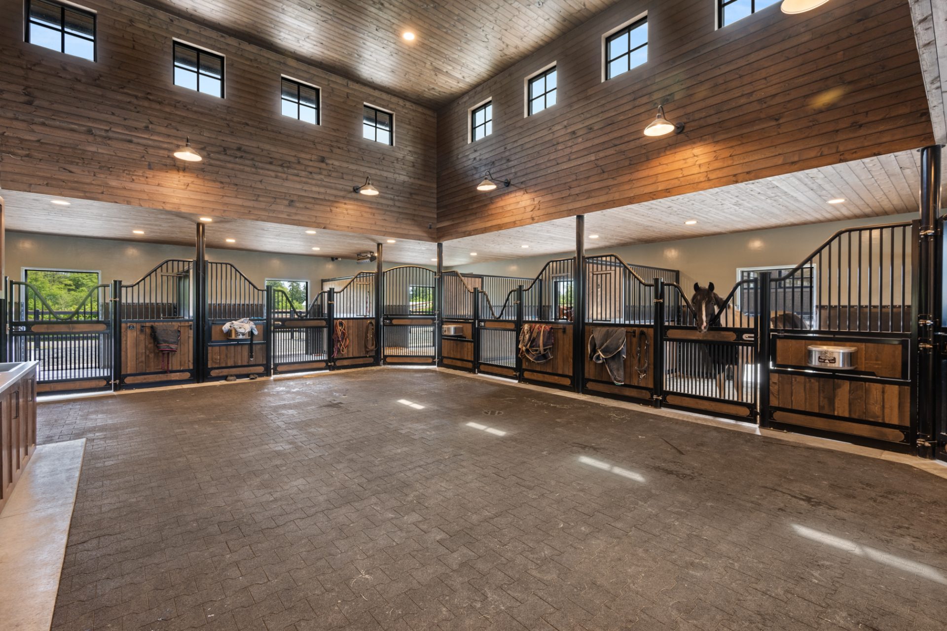 This recently completed 14-stall facility includes 2 wash and 2 grooming bays, a feed room, hay room and tools room, a vet laboratory and ventilated blanket closets. Also in the design are two tack rooms; one for private use by owners and one for boarder’s use, equipped with tack lockers.
