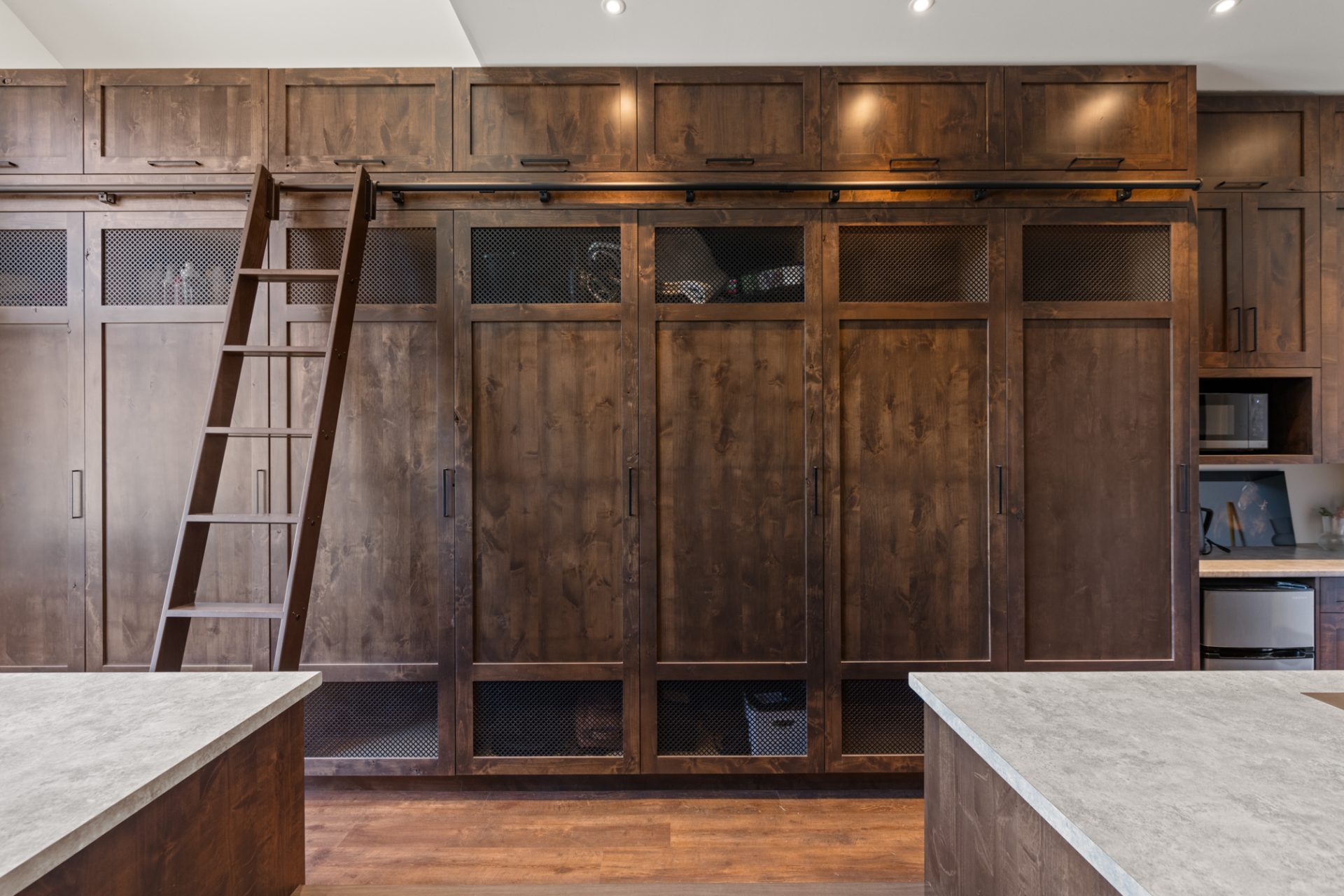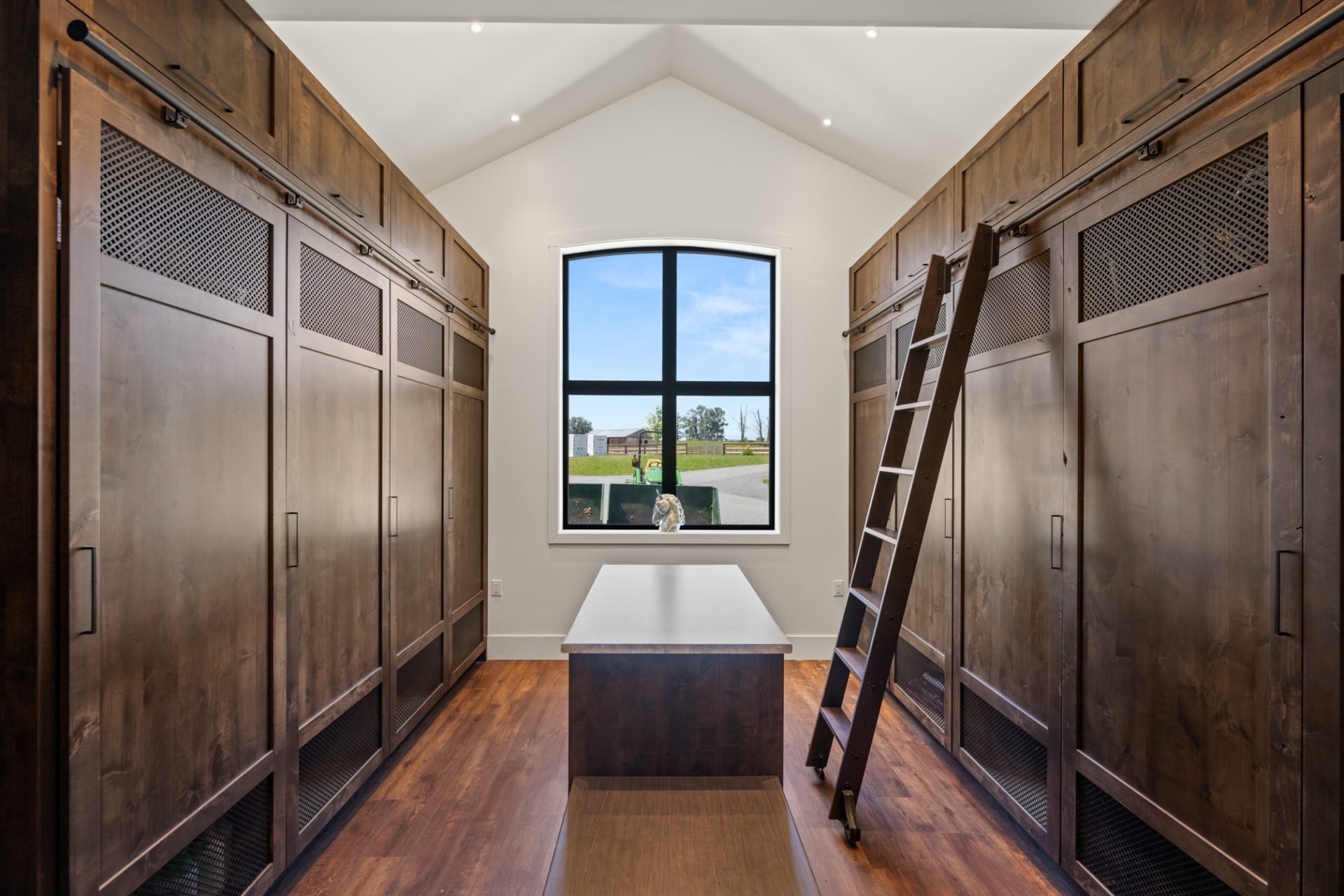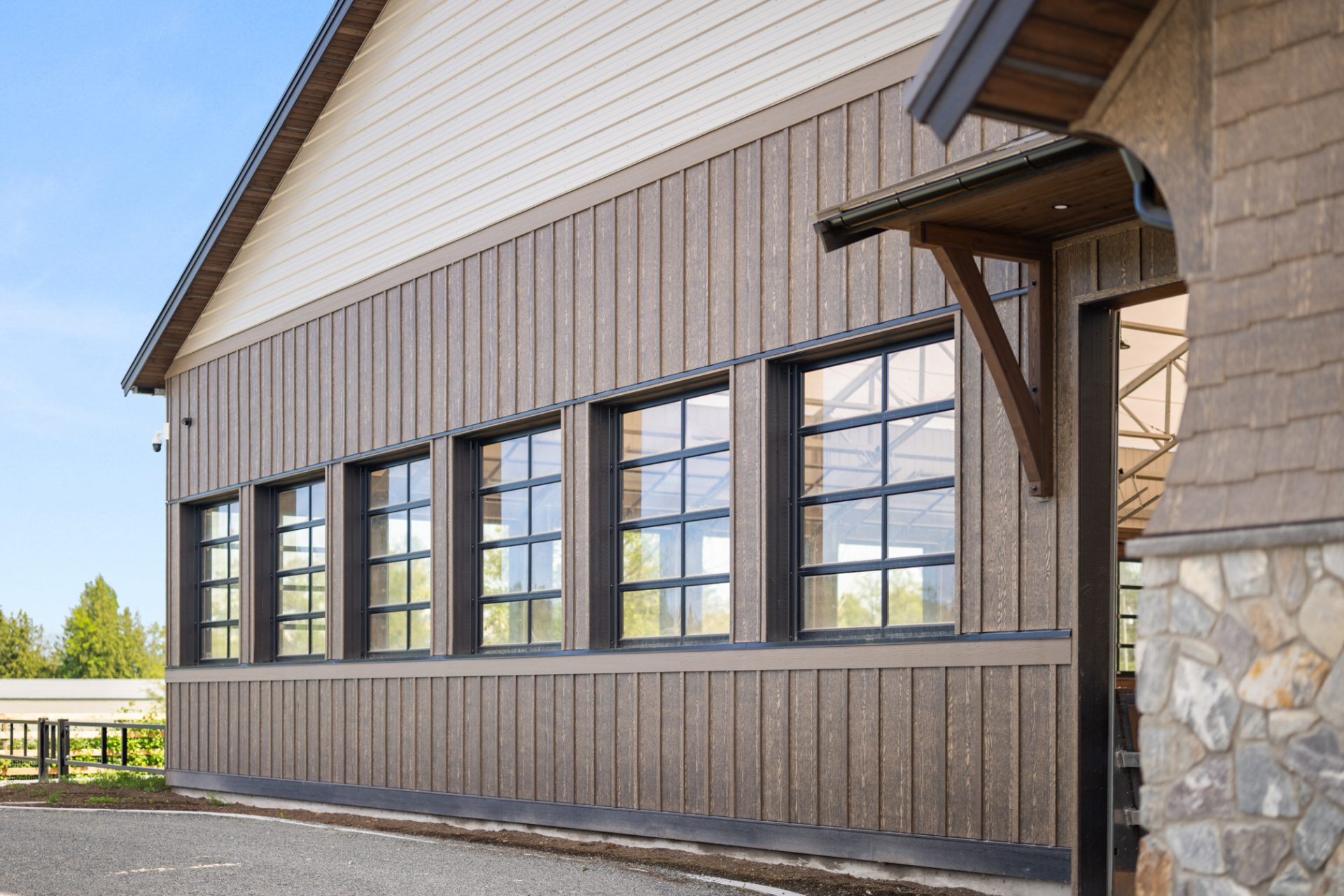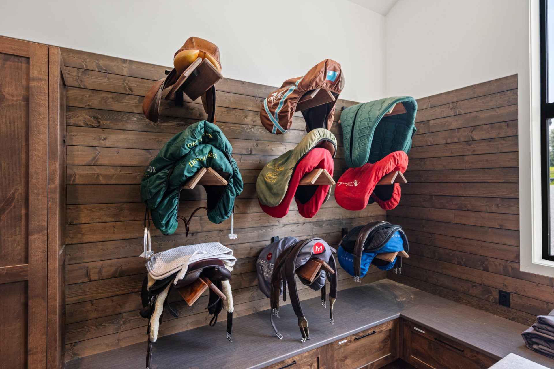 This recently completed 14-stall facility includes 2 wash and 2 grooming bays, a feed room, hay room and tools room, a vet laboratory and ventilated blanket closets. Also in the design are two tack rooms; one for private use by owners and one for boarder’s use, equipped with tack lockers.