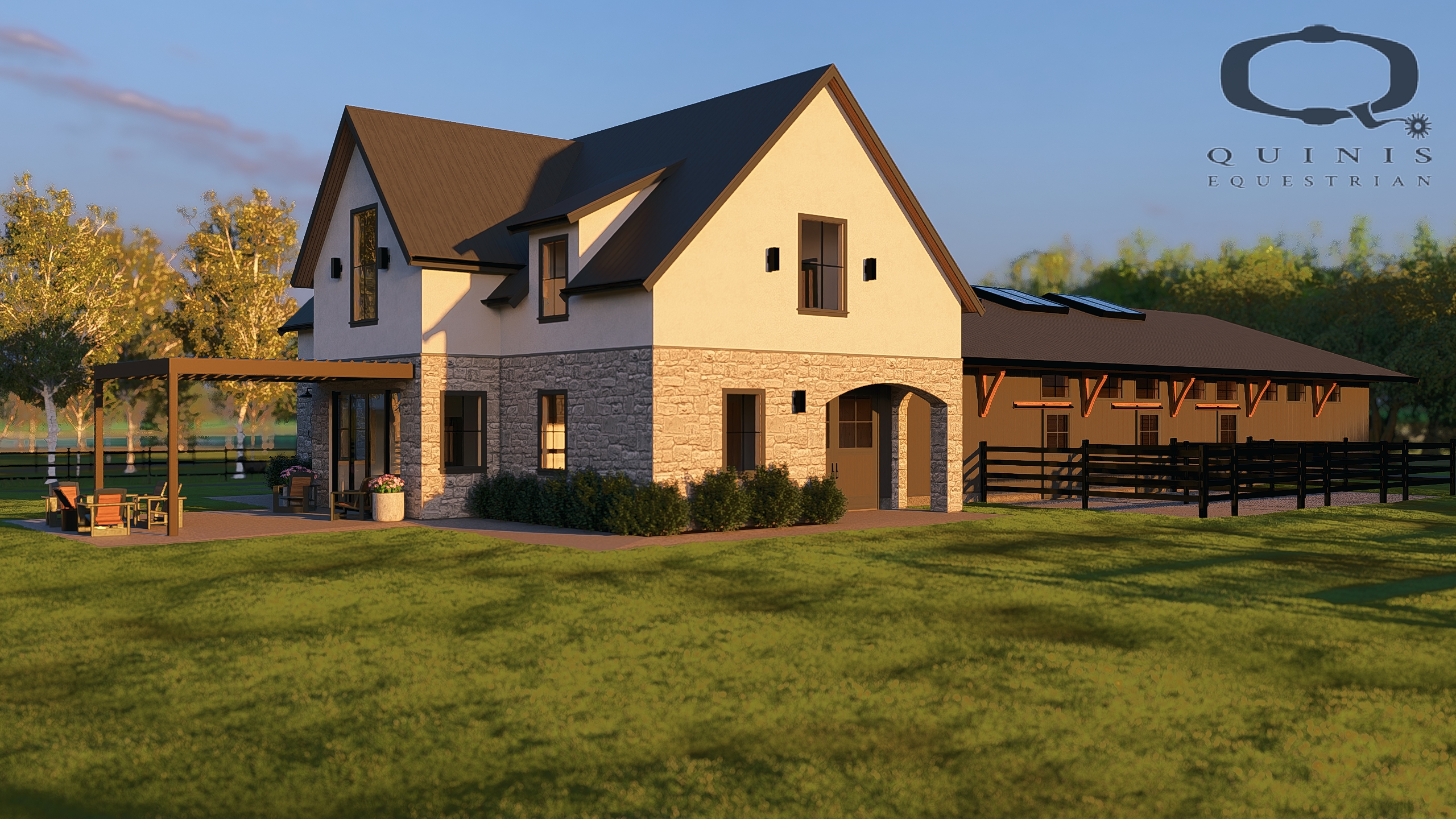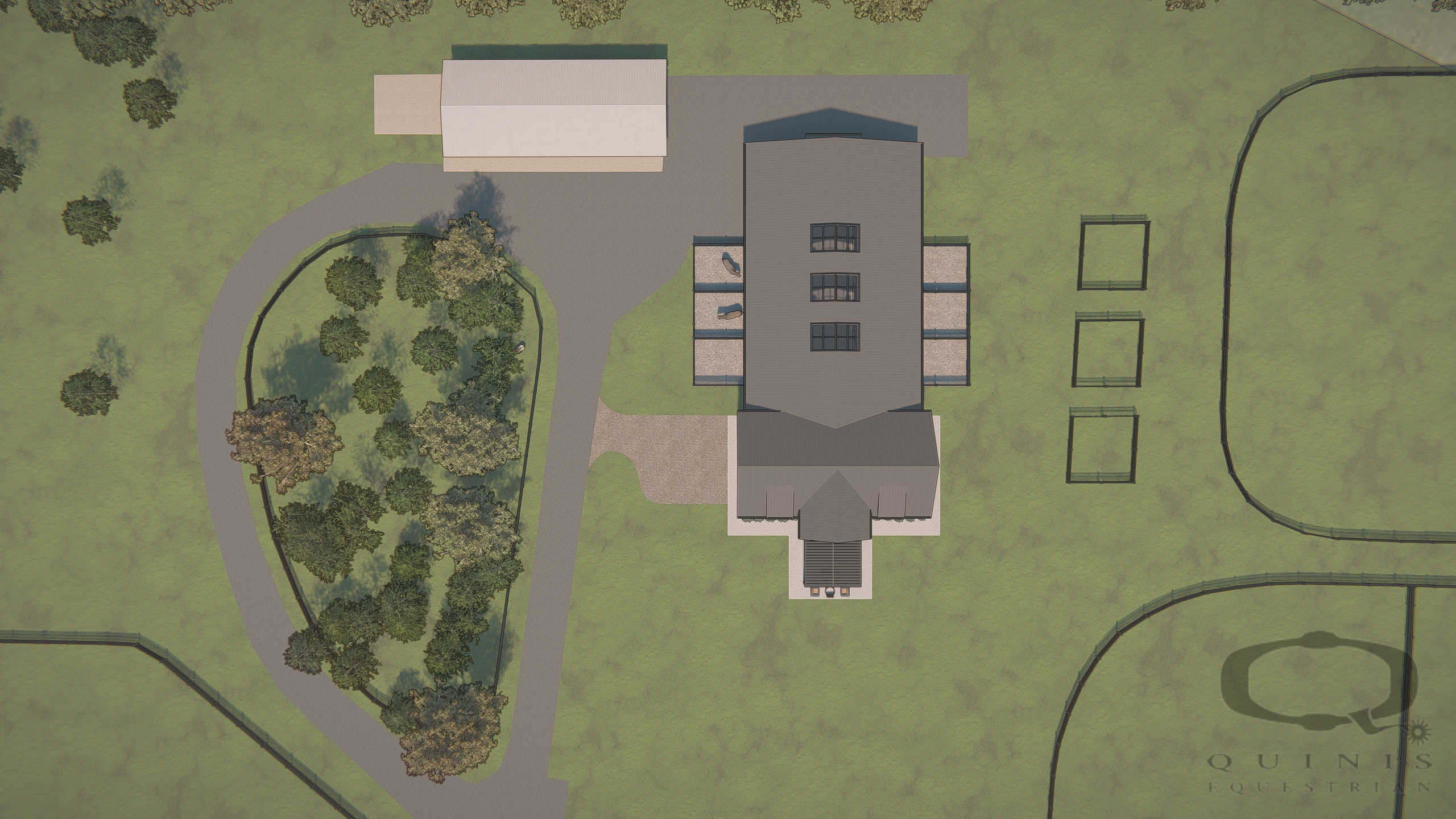 This design showcases six stalls, a hay & bedding room, tack, groom and wash stalls with blanket storage, and a covered indoor/ outdoor lounge.