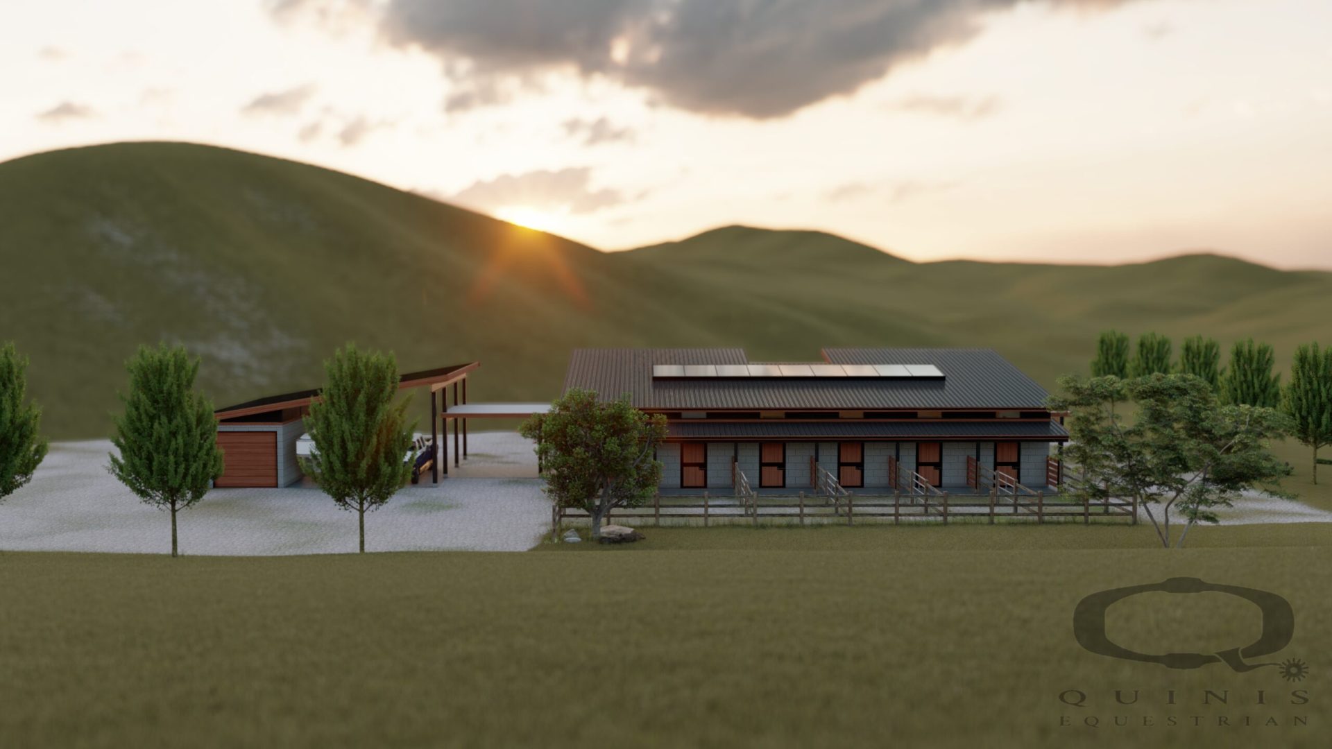 This 6-stall design also incorporates a few site-specific features, such as direct walk-out access to turnout and a look-out from the tack room to an impressive view. A long-term hay storage building is combined with covered vehicle & trailer parking, and a smaller, short-term hay loft is planned inside the stable.