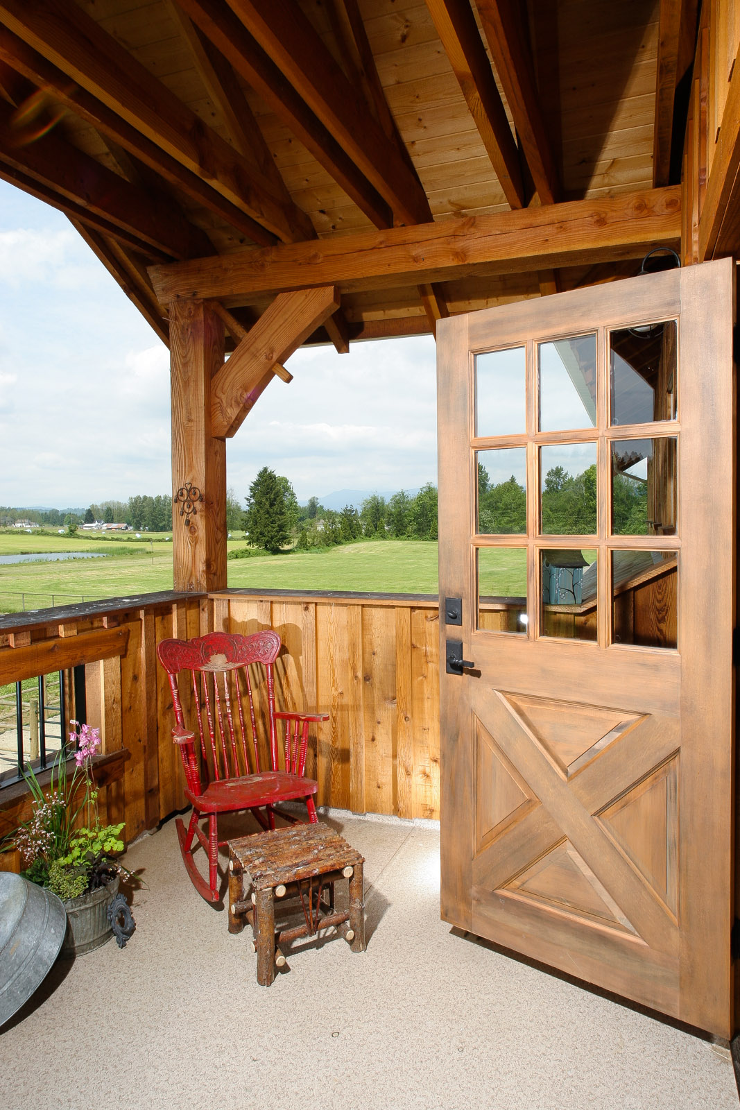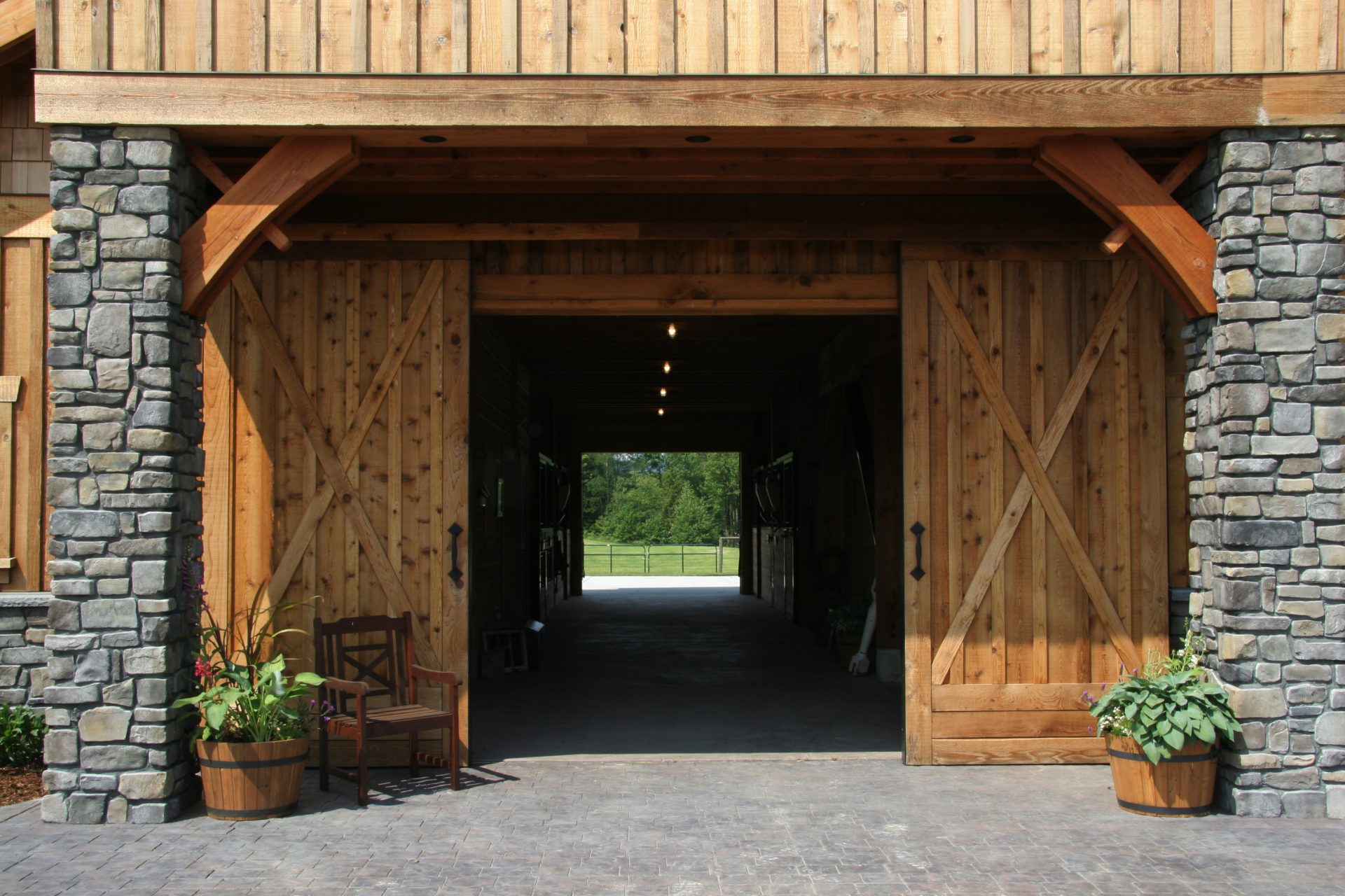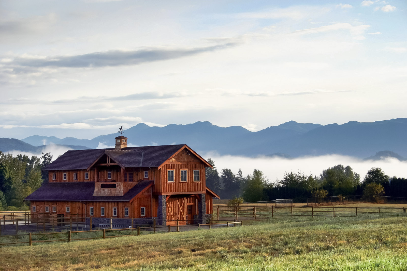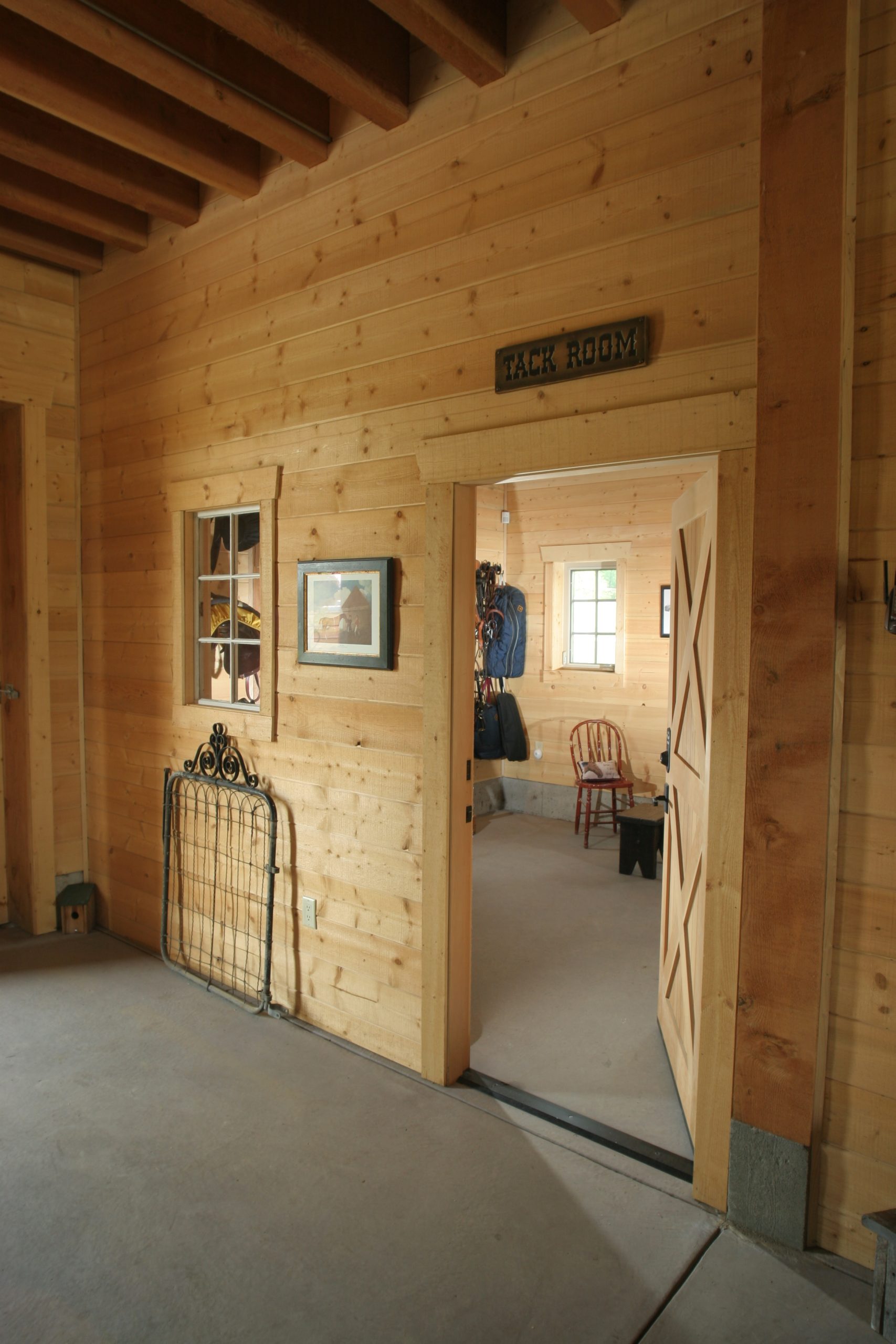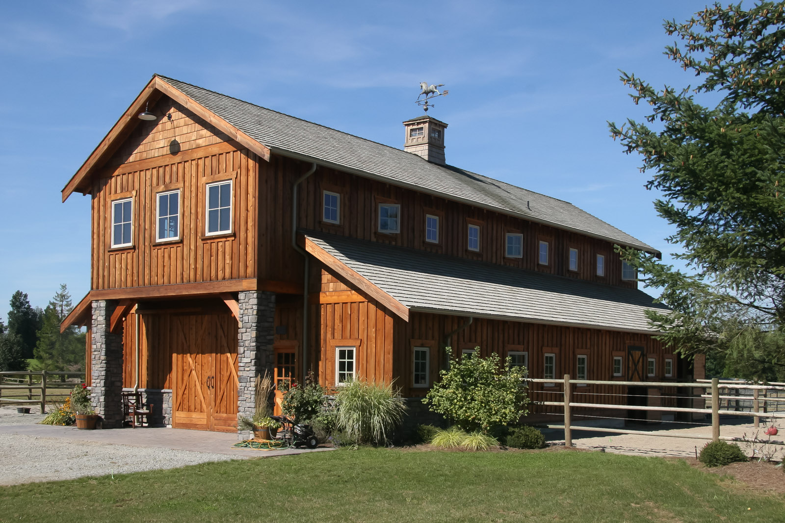The barn is designed to be a classic monitor style, yet still complementing the house. It also accommodates other interests; such as entertaining upstairs and storing farm equipment.