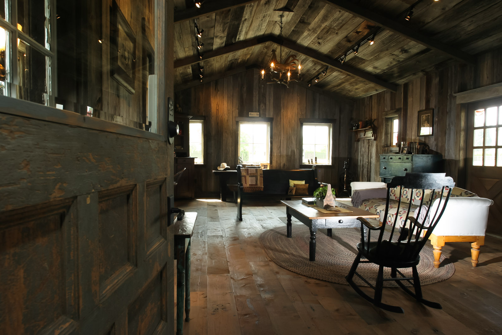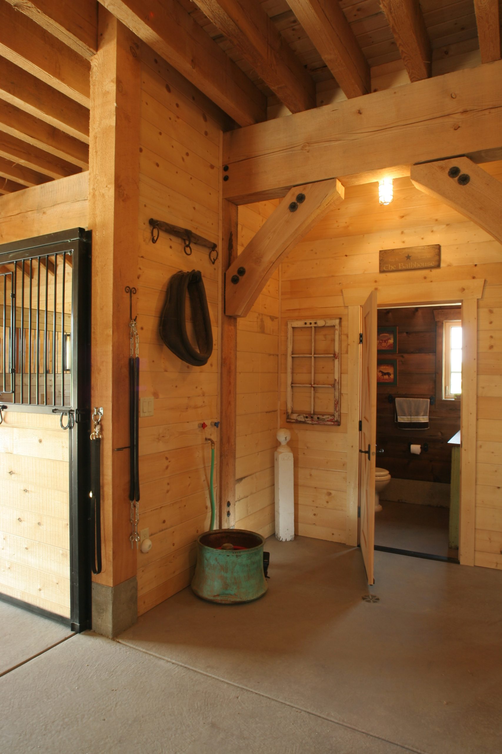This barn features a full wood interior with an antique, re-claimed wood lounge room on the second floor. The interior of the main floor includes four stalls, tack room, bedding room, wash rack and grooming area, bathroom and tractor storage.