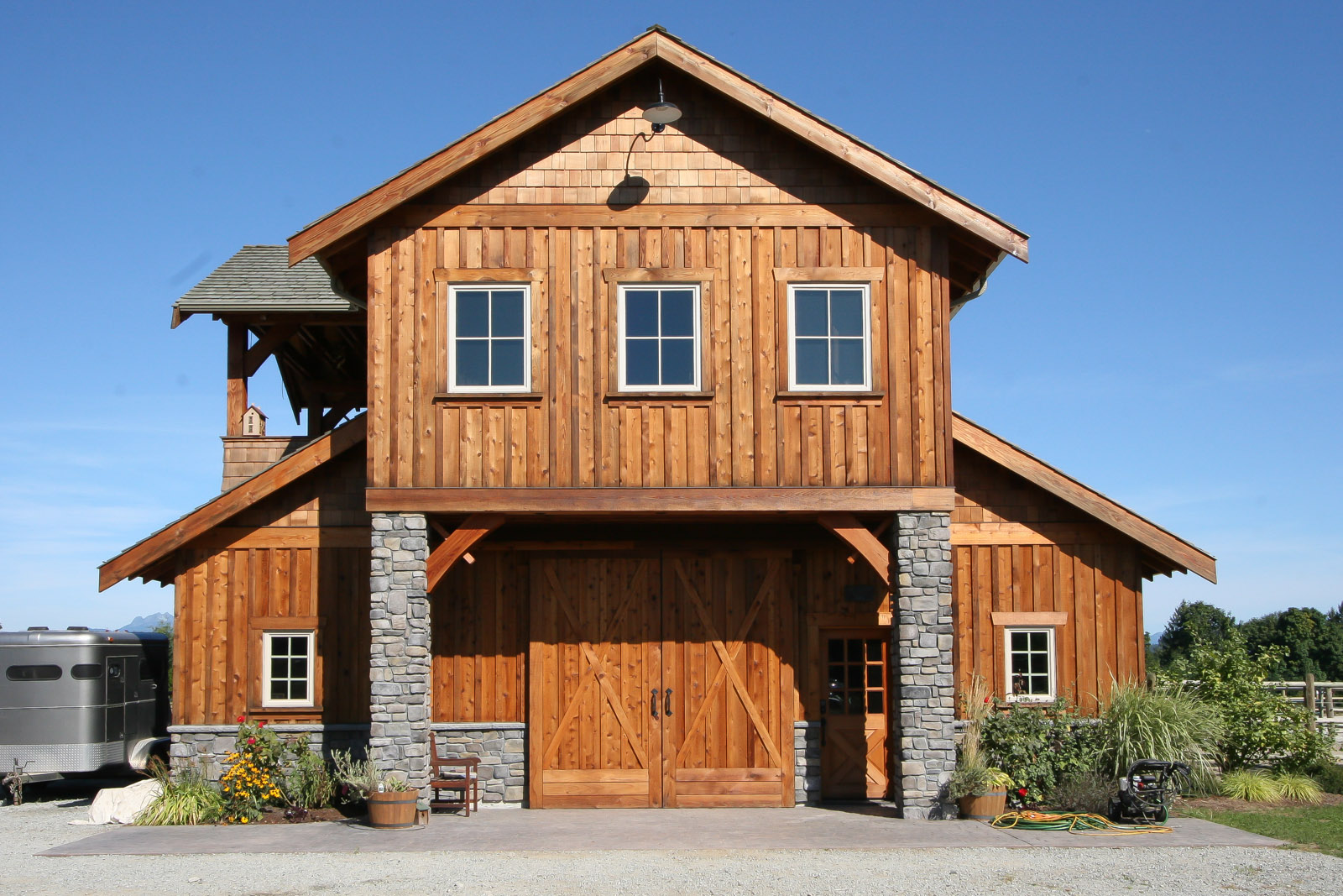 We worked with our clients to create a building resembling the barns they recalled from their youths in Alberta. It features hints of sophisticated mountain ranch style, popular in B.C.’s lower mainland and the American mountain west. The 39′ x 78′, four-stall barn yields more than 6,000 square feet on both levels.